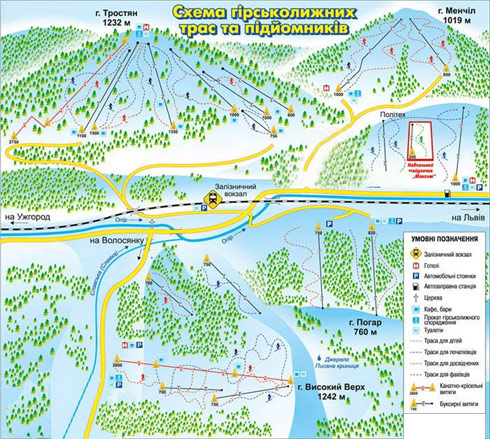 Кращі і найцікавіші траси розташовані на горі Тростян. З цієї гори кататися можна майже в будь-яку сторону - схили там розділяють на західний, північний, центральний і східний. На Тростяні довжина крісельного підйомника - 2750 м, а бугельних від 600 до 1200 м.